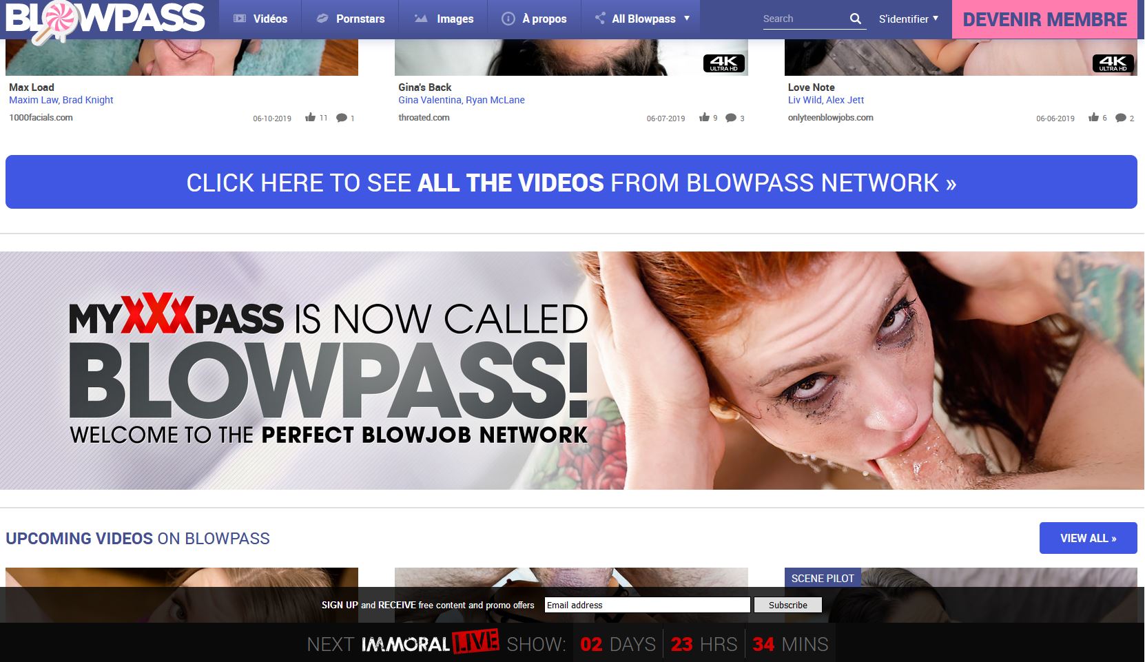 Sur Blowpass les filles battent tous les records d'apnée, elles sucent des bites gigantesques pendant des heures et elles le font bien. Des tas de vidéos de qualité avec des nanas qui dévorent la bite de ses pauvres types sans demander leurs restes, ce contenu de qualité vous le trouverez sur Blowpass et nulle part ailleurs. La page d'accueil vous proposes de voir les dernières vidéos sorties et celle à venir. Un onglet pornstars vous permettras de savoir laquelle de vos salopes préférées et présentes sur le site, avec en prime, une courte description de chacune d'elles. Sur Top Site Adulte nous nous efforçons de vous trouver des sites qui propose du contenu de qualité, si vous êtes un fétichiste des pipes, et bien sachez que vous êtes à présent servis.
