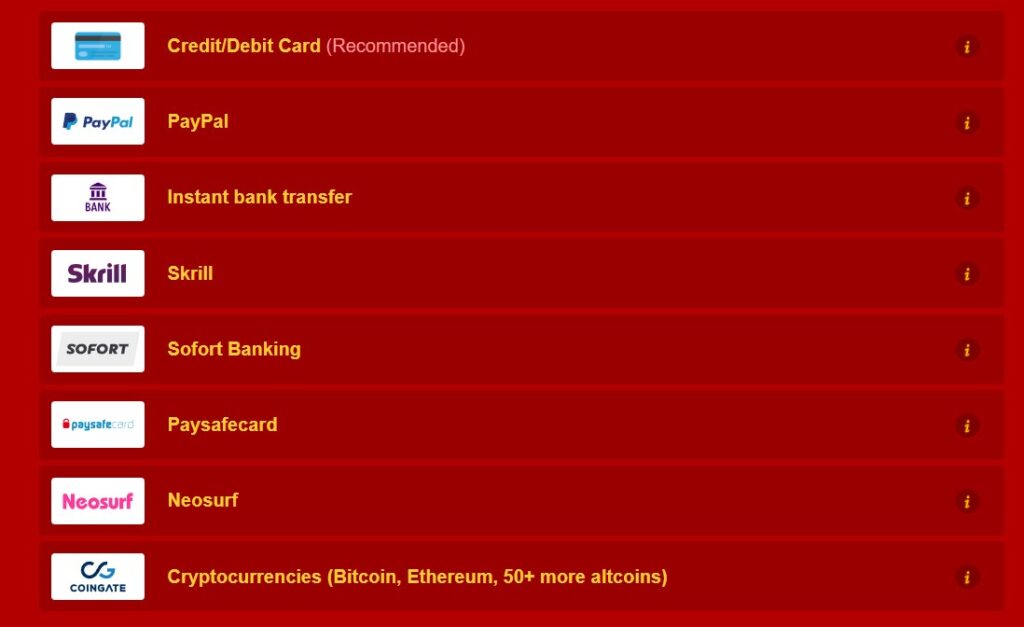 Kredi satın alabilirsiniz : Paypal, Paysafecard, Neosurf, Cryptocurrency, Banka kartı, Banka havalesi, Skrill, Sofort